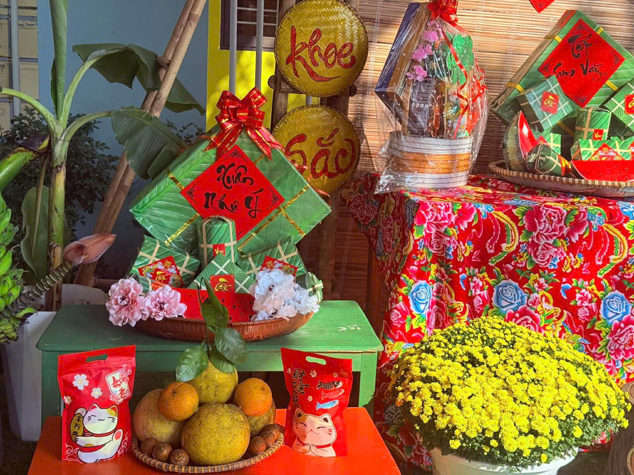 Những ngày cuối năm, ngôi trường mầm non Tân Giang như khoác lên mình chiếc áo mới rực rỡ sắc xuân. Từ cành mai vàng, cành đào hồng, những chiếc đèn lồng đỏ đến góc trưng bày bánh chưng xanh – tất cả đều được bàn tay cô giáo và các bé trang trí tỉ mỉ, mang đậm không khí Tết cổ truyền Việt Nam.